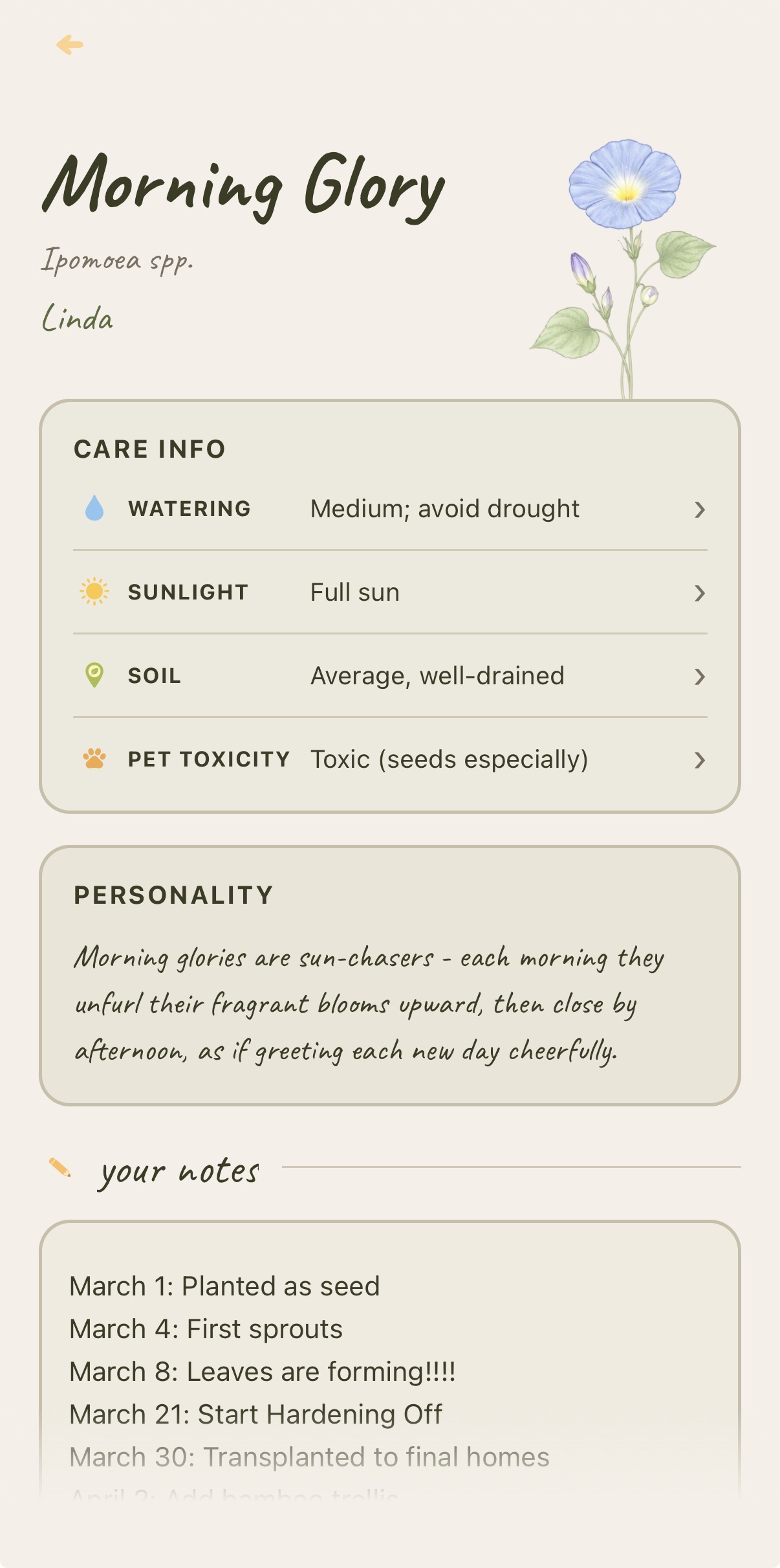 Sunlight, watering, soil, and pet toxicity details are preloaded, so the basics are already there when you need them.
